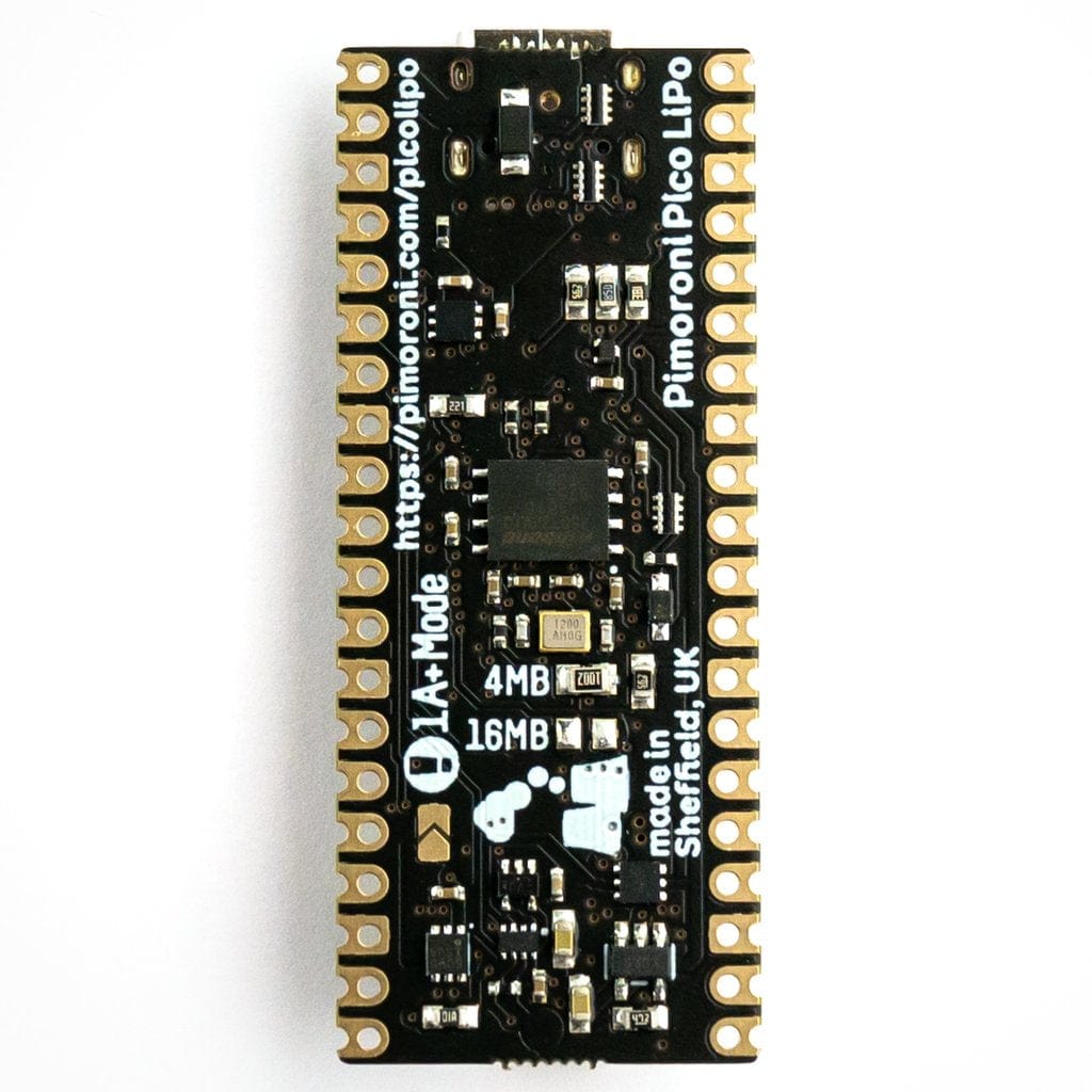 The Pimoroni Pico LiPo is powered and programmable via USB-C and comes with a choice of 4MB or 16MB of QSPI (XiP) flash on board (select version before adding to cart).